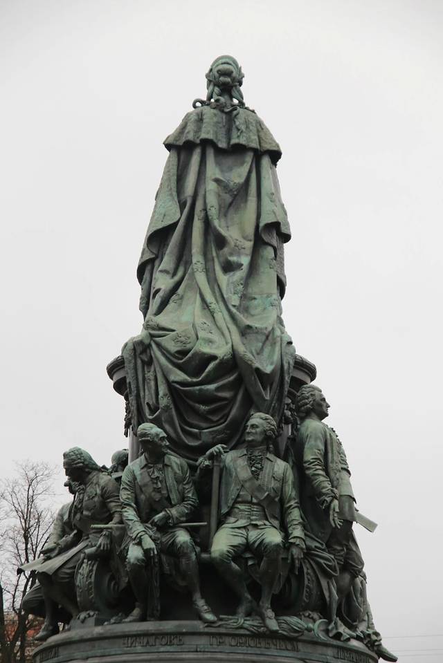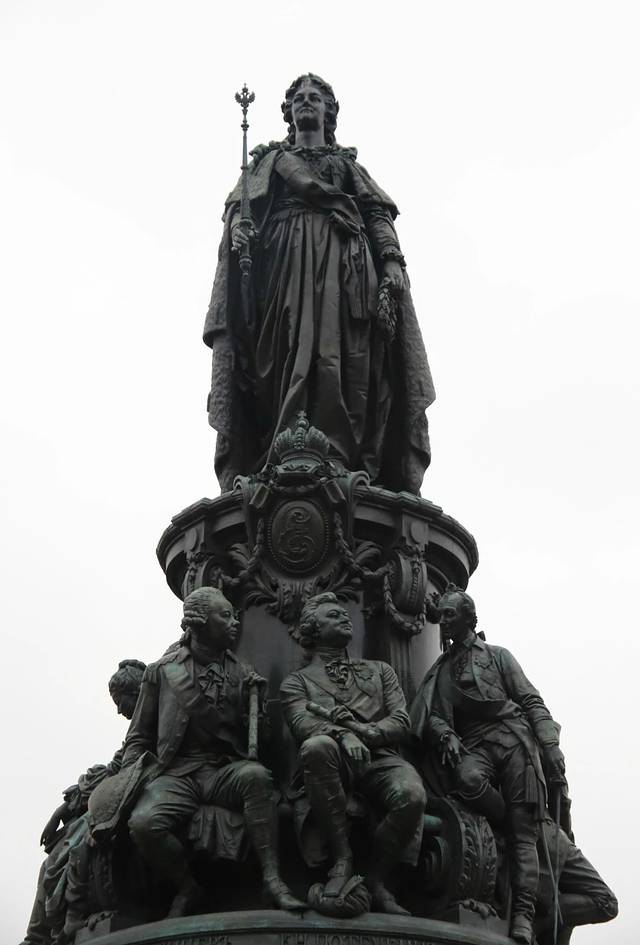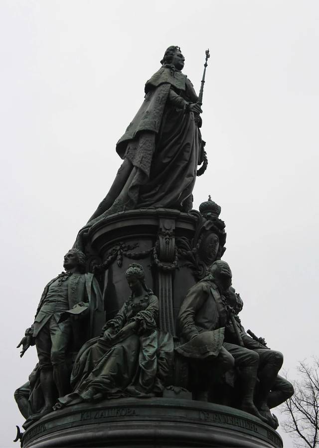雕像于1873年亚历山大二世建造,这个雕像有四层底座,叶卡捷琳娜站在最上面一层。她披着华丽的斗篷,手握权杖。在雕塑的第二层,是她的十二个宠臣,其中包括她的侍女。