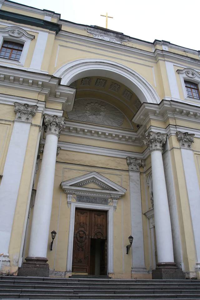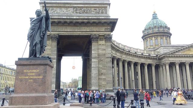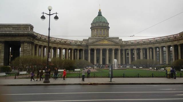 《喀山大教堂》——1801年“保罗一世”出访罗马后,下令建一座存放俄东正教圣物“喀山母圣像”的罗马式教堂,以“喀山”取名。工程历时10年。由于东正教教规:“圣堂必须面向东方”。这样造成教堂是侧面对着涅瓦大街。建筑师们采取了极其巧妙方法处理难题:在侧面,设计二列壮观的弧型柱廊;大教堂正门,设计造型古典向外延伸式柱廊;两侧弧型柱廊形成一个半圆形广场;弧型柱廊的后面中央露出高达70米的教堂圆顶。这样既保持了大门的威严,也感觉不到涅瓦大街这边不是教堂的正面。