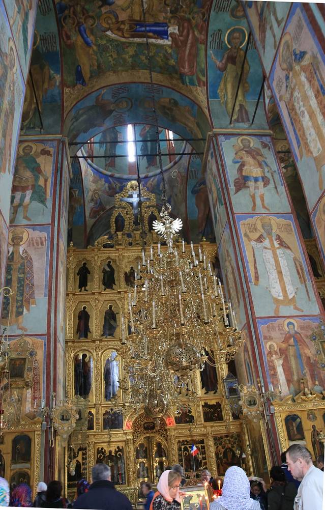 克里姆林宫9个金顶教堂就是天使报喜教堂,建于1484-1489年,是皇宫家家用礼拜堂,也是举行皇族婚礼、皇子受洗的地方。这是克里姆林宫允许游客参观的教堂,不能拍摄,俄导说:里面保留着俄罗斯最古老的圣像壁画,有一幅最珍贵的十字架画。