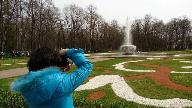 我们先游波罗的海,从海边沿着笔直的水道走回,远处就能望到主宫殿和那座最有名的喷泉,喷泉群是由37座金色雕像,29座潜浮雕,150个小雕像组成。