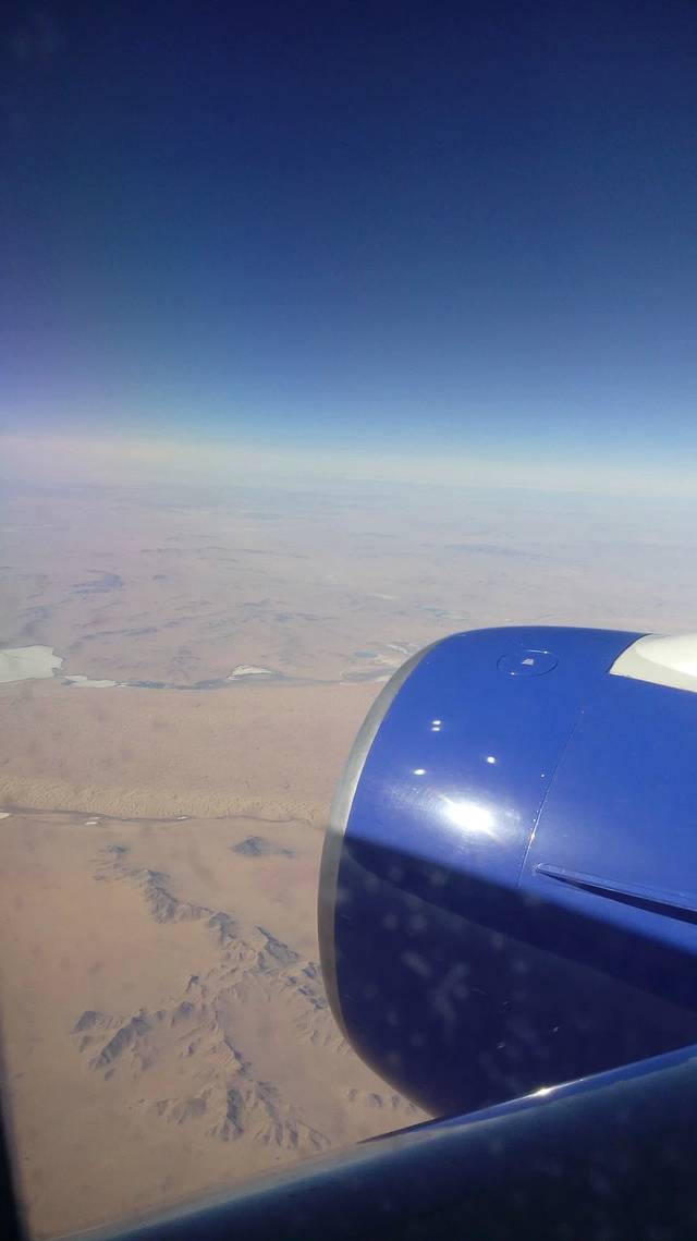 从香港飞到莫斯科要10小时,途经一片一望无际的沙漠,从飞机向下望,只见沙漠间还有山丘、有湖泊,让闲静在飞机的我,浮想联翩。想到万马奔驰在沙漠的油画;想到了这荒无人烟的戈壁滩上,一队策马扬鞭的风烟;我的幻想也浩瀚起来……。我拿起手机,拍下这一幅幅无法描述的浩瀚无垠沙漠,当然,我只能拍到浩瀚沙漠的一个角落。