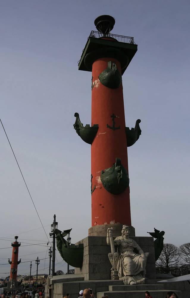 在圣彼得堡的涅瓦河畔,耸立着两根高32米、有两尊红色的柱形灯塔,是为航行在涅瓦河的船只引航。两个灯塔的基座上共有2男2女四个雕塑,分别为伏尔霍夫河、涅瓦河、的聂伯河、伏尔加河。