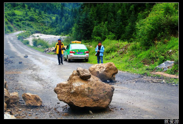 山上滚下的巨石,堵在路面中,好在小车还可以勉强从中间绕过,大车就过不了,真是很吓人。