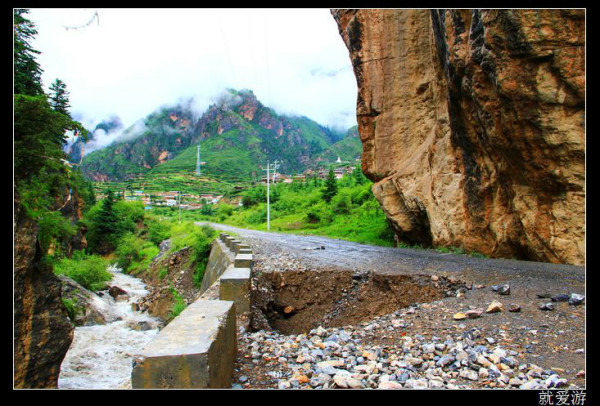 就在扎尕那的路口,被一夜大雨冲坏的路基。