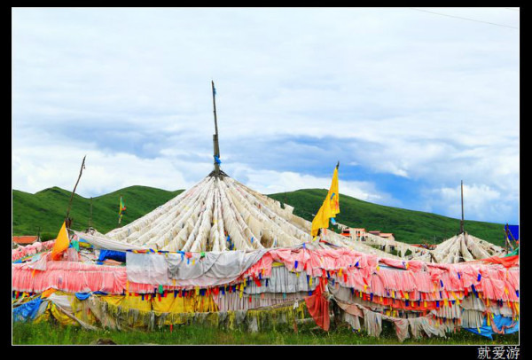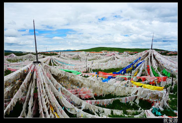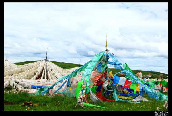经幡是藏区普遍存在的一种图腾,它是在布、麻等织品上书写经文,然后系在绳索上,红原瓦切的经幡是围成一顶顶园帐篷似的,而且瓦切经幡群面积之大也为藏区所少见。