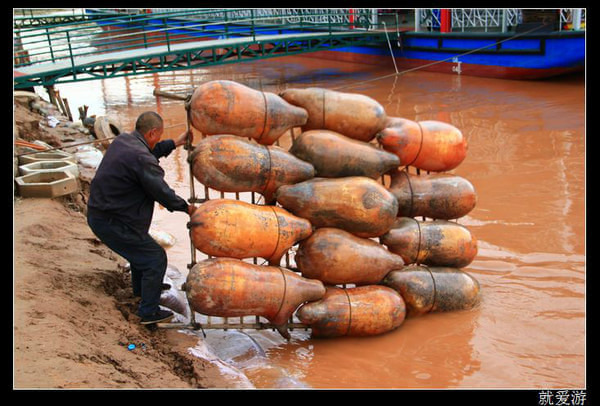 羊皮筏子俗称“排子”,是一种古老的水运工具。它由十几个气鼓鼓的山羊皮“浑脱” (兰州羊皮筏子分大、小两种。最大的皮筏用600多个羊皮袋扎成,长12米,宽7米,6把浆,载重量在20至30吨之间。