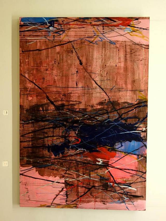 邹明的综合绘画,纸本、布面,兼而有之,泼墨、泼彩,偶入泥土、沙子等,墨韵、材质、肌理,融为一体,多以抽象为主,注意大气象。