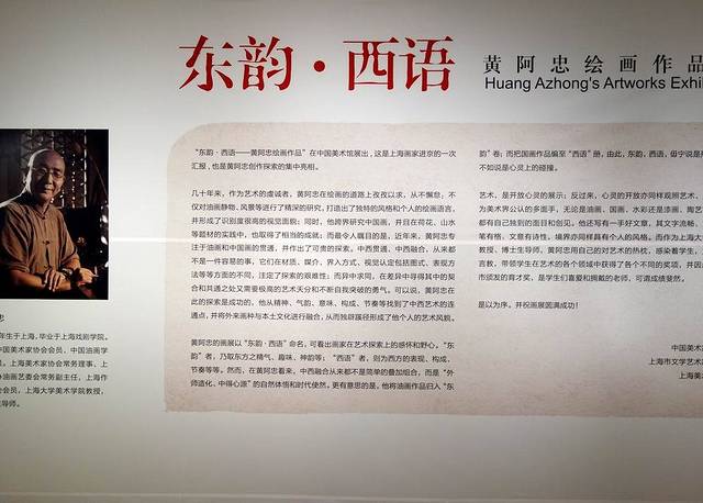 “东韵西语”黄阿忠绘画作品展是由上海文学艺术家联合会、上海美术家协会、上海大学、新民晚报社、上海刘海粟美术馆联合主办的。