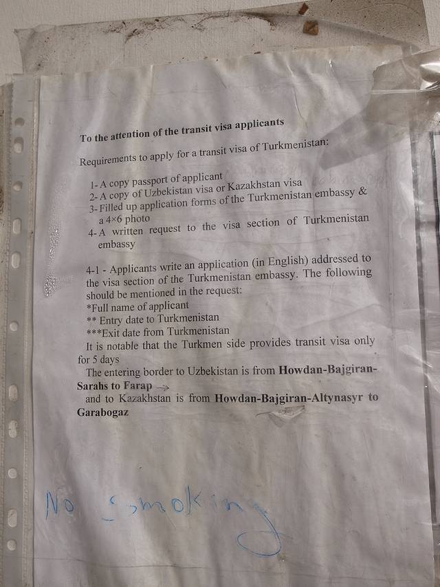 如果要从伊朗走丝绸之路陆路回国,土库曼斯坦是必须要经过的。但在办理这个国家的签证时就对这个国家产生了深深的忧虑,工作时间为周日到周四9:00-11:00,但是实际情况是那扇小窗户基本不怎么开。由于乌兹别克斯坦签证受挫,我们只能拿着哈萨克斯坦签证再去签土库曼斯坦的过境签,赶上伊朗新年,所以我们是在离境伊朗的最后一天才在马什哈德拿到土库曼斯坦签证的。
