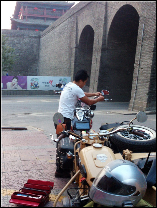 考虑到风景和我朋友的时间关系,我们的边三轮之旅始于西安,我们把车大箱从上海物流到西安,物流很给力,三天就到了西安(比顺风还给力啊),我们在客栈接到电话都不敢相信,上海的挎友雪茄客特地到西安来为我们送行,而且在西安给予了我们很大的帮助。西安当地的挎友,同时也是西安最好的边三轮技师肖广也来帮助我们一起开箱,还真帮我们解决了大麻烦!