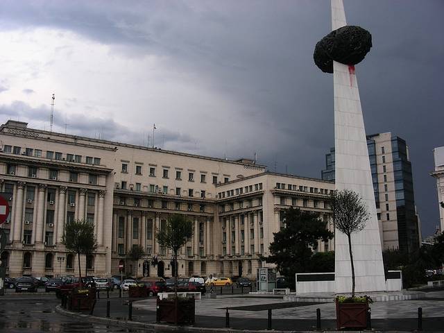 这两座建筑旁边的广场叫做革命广场,1989年,罗马尼亚人民反对齐奥塞斯库统治的游行集会就发生在这里,齐奥塞斯库最后一次露面,发表公开讲演,就在广场尽头的罗共中央委员会大楼的大阳台上。今天这里有一座纪念碑,纪念那场革命和抗议当中死难的群众。