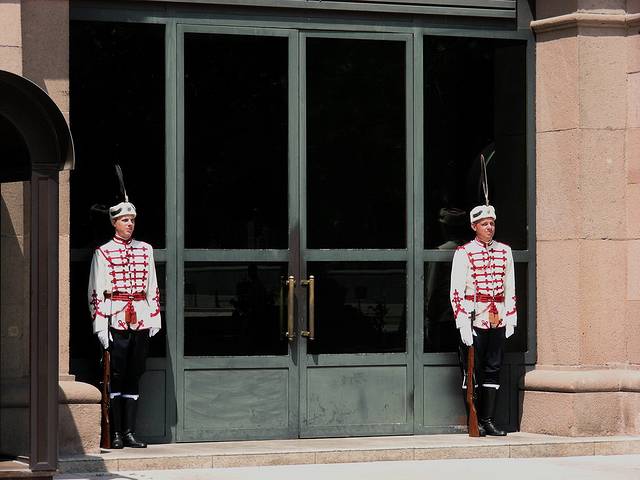 共产党中央委员会大厦街对过,是总统府,总统府院子里还保存了古罗马时代的要塞遗迹,任何游客都可以随便走进开放的庭院参观。总统府大门口每小时有哨兵换岗仪式。