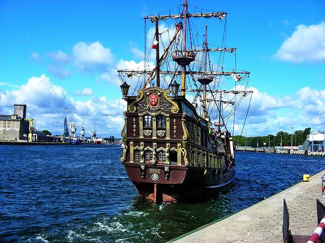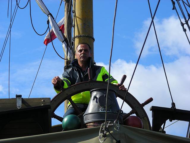 木帆船其实不是古物,是现代仿制的17世纪三桅武装商船,并非真靠风帆行驶,还是用发动机的。两艘船轮流往返,这是我去的时候所坐的“狮号”(Lion Galleon,波兰文Galeon Lew),出了城一路两岸的景物都是船厂工业区,还有远洋轮船,并没有什么美景,真正好玩的是船本身,雕刻精美,华贵非凡,高耸的艏楼和艉楼上还有小型铜炮呢。这是我们的波兰船长在掌舵。