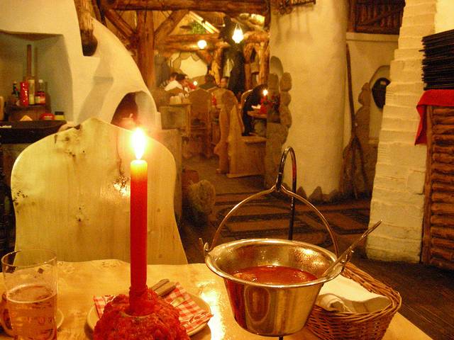 罗马尼亚的国菜,传统食品叫做Samarle,是用卷心菜叶子,裹肉末,米饭,各种香料煮出来的。当然有各种改良版。我那天在革命广场附近的Restaurant Vatra吃的Samarle,是用葡萄叶裹肉菜做的,上面还浇汁酸奶油。这家餐馆的环境很好,装饰风格很有民族特色,菜也不错,值得推荐,他们有官方网页