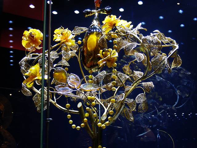 我到这里才知道,琥珀的颜色从接近乳白的淡黄,到深褐色都有,而且通透性不同,价格可以相差很大。2009年的时候,我在俄罗斯圣彼得堡郊外的皇村,叶卡捷琳娜夏宫里,看到过完全由琥珀镶板装饰的“琥珀房间”(复制品,原件毁于1945年),那显示了波罗的海沿岸琥珀藏量的丰富。而在这里,更多地看到各种各样用琥珀制造的精美首饰