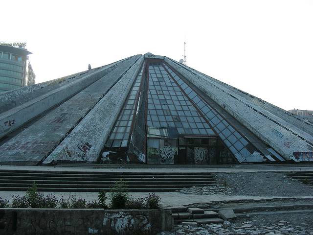 从广场向南走,跨过Lana河桥,大道左手有座被废弃的金字塔型方锥体建筑。