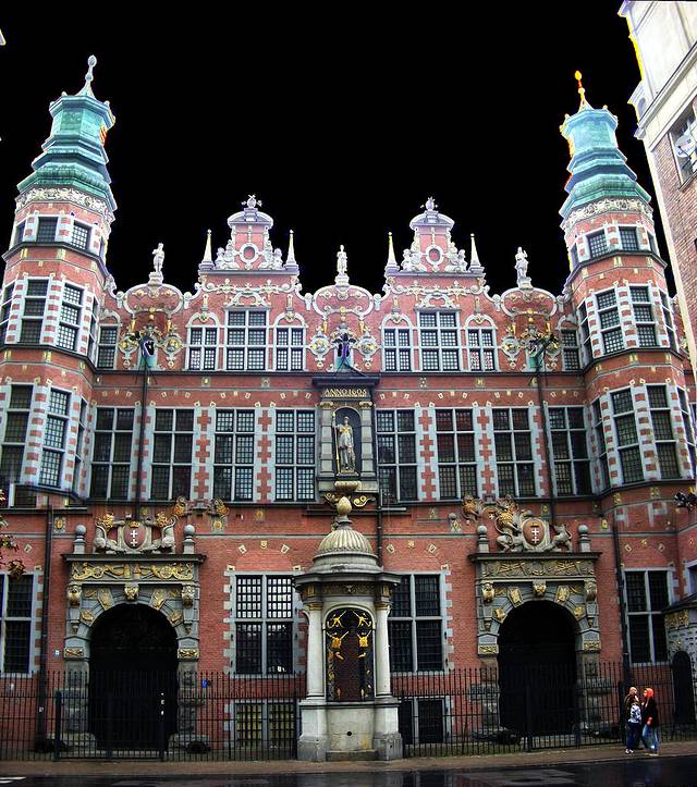这是格但斯克的军火库,建于16世纪,相当于明朝,看上去非常讲究吧?照片也有点意思:当时阴天,我一向用傻瓜相机,曝光时间长,天空就肯定过曝,我后来在ACDSee里面,想在曝光项下调弱“填充光线”,补救一下,没想到失手调到0,天空整个是黑的,觉得效果也满好玩,于是就保留下来了。