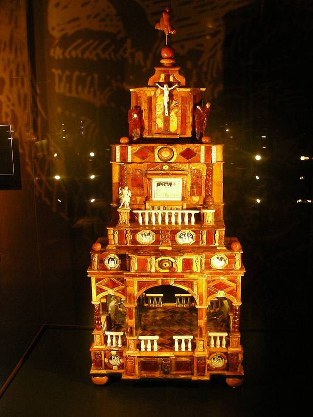 也有大件琥珀工艺品:城西的圣布里吉特教堂St. Bridget Church里,圣坛用巨型整块琥珀制作,现在还没完工,游客能看到部分完成的圣坛,要看完工以后的形状,这张效果图更清楚。