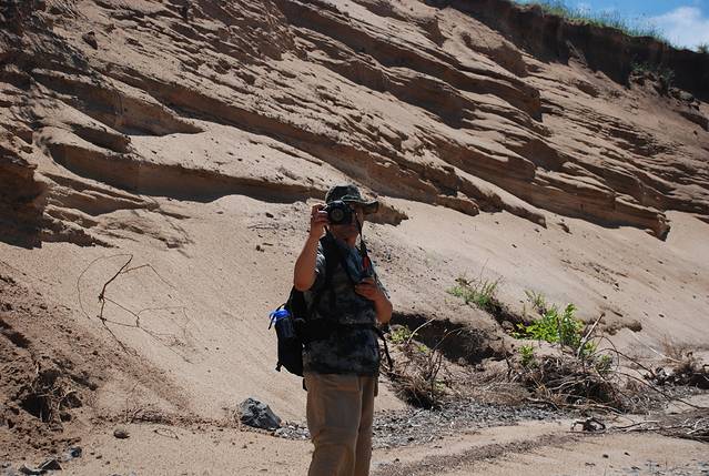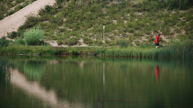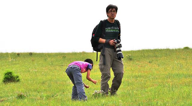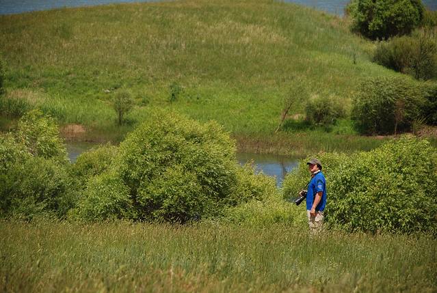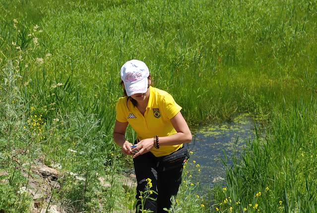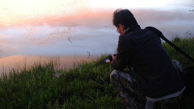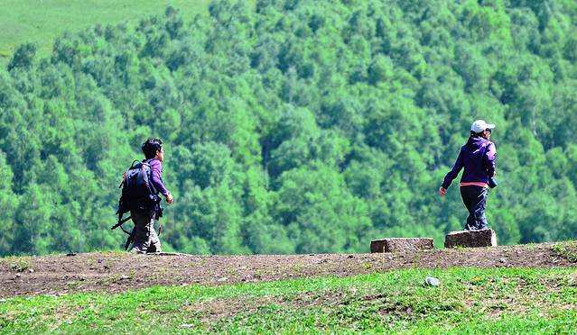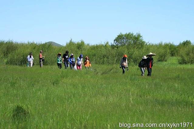 有点时候湖边的路不通需要绕行草地,领队就走在最前面,用手台通知大家注意脚下沼泽,跟着他的轨迹走。