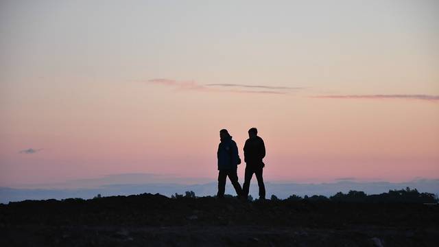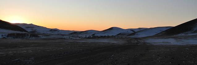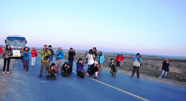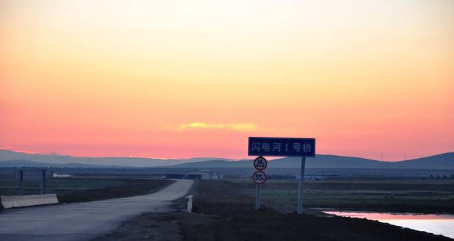 发车了,路上是行程介绍,我也没怎么仔细听,夜色就慢慢地沉下去了。一夜无语,黑灯瞎火的,我也不知道大巴行驶在什么公路上,也不知道哪儿是哪儿,昏昏沉沉地颠簸中感觉车子靠边停车不走了。静静的公路边夜空下,只有发动机的突突声在给车上的队员供暖。一打听,车子停靠在比较安全的“塞北管理局”前,著名的“闪电河”附近等日出。