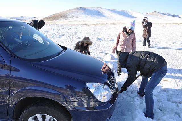 既是小范围的活动,大家放的更开了,车子都开到湖面上耍去了!人一折腾就也不觉得冷了,随便就滚躺在雪地上撒欢什么的。