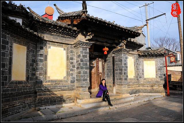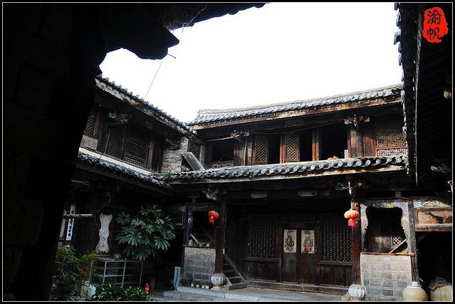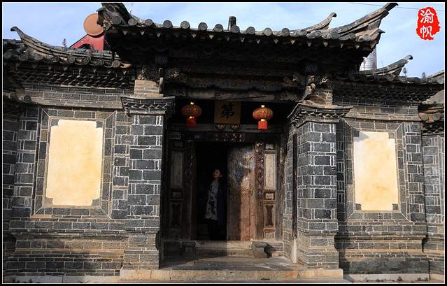 沿着村子里磨得光滑的青石板路前行,一座一座的大宅院次第呈现在我们面前,虽然这是西南边陲,其建筑风格却是典型的江南庭院,青砖粉墙,斗栱飞檐,雕梁画栋,历经岁月洗礼,墙面斑驳,略显老旧,有个别宅院甚至已经风化、破败成为危房。但也有一些宅院保存相当完好,比如最北边的“张家花园”。宽敞的四合天井中,青石围池,碧水微澜,天井四方,两层的厅堂宅屋上下都可四围连通,正是“跑马转角楼”的大气布局,雕花门栏,镂空窗棂,巧饰各处,唐璜而不烦杂,华丽而不俗气,团山古民居群过去的辉煌一揽无余,“张家花园”因此也成了团山村古民居群的代表称谓。
