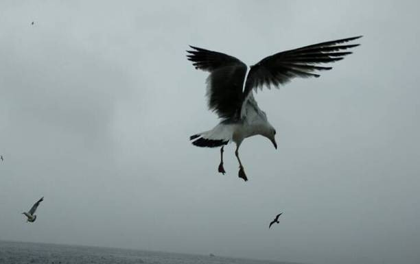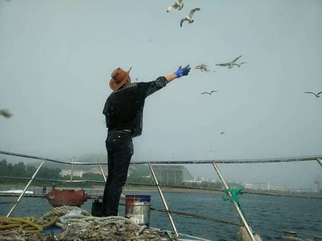 开船后,船头船员站在外面抛鱼喂海鸥,行驶中游客不能私自到船舱外面。