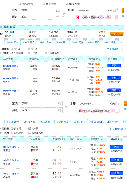 图三:上图为济南到威海的火车票时间及价格,下图为济南到荣成火车票的时间及价格