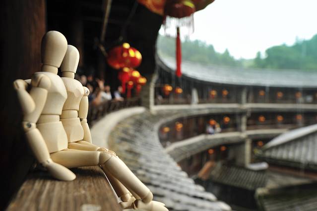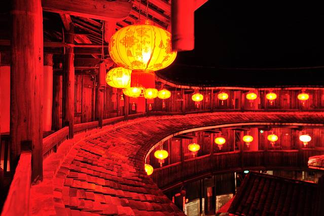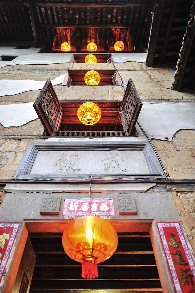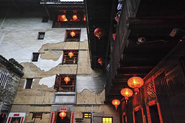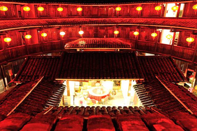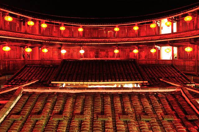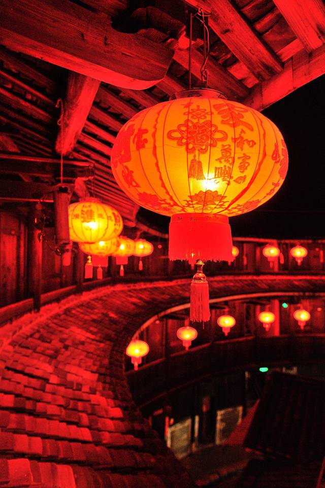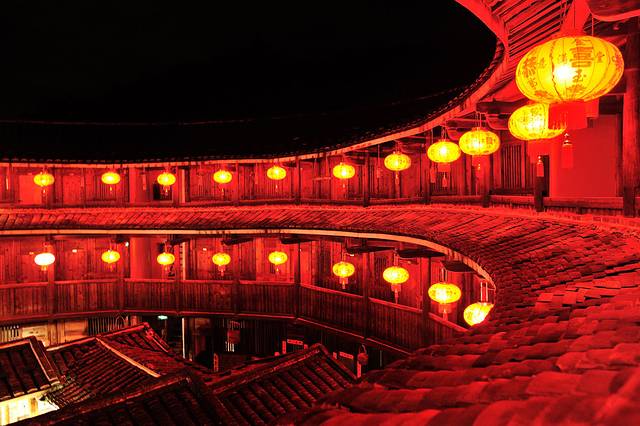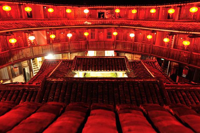 永定土楼的日与夜。如果说白天的土楼是一个市井味浓厚的封闭社会,那么夜晚的土楼就是一个神秘到让人产生迷情的方寸天地。夜晚的土楼,不似读书夜生活般的纸醉金迷,也没有江南水乡夜晚的灯红酒绿,有的更像是来自异度空间的跨时空问候。或许也只有在这样的环境氛围中,才能完成心与心的交流,坦诚地与历史对话。