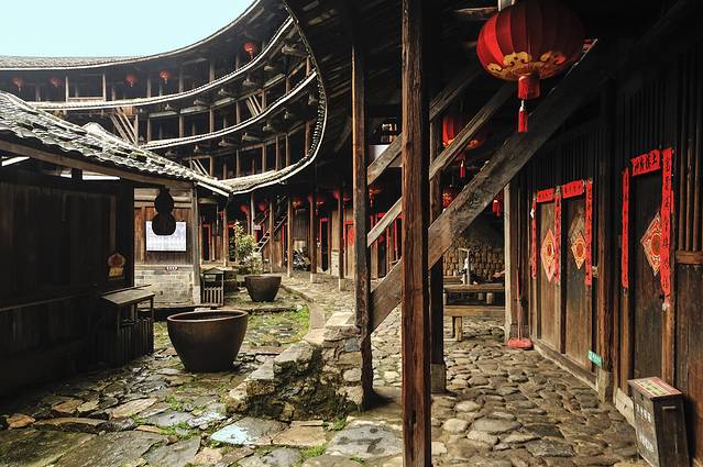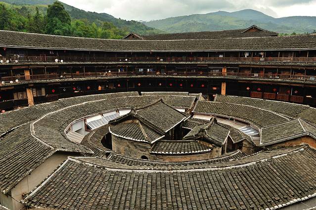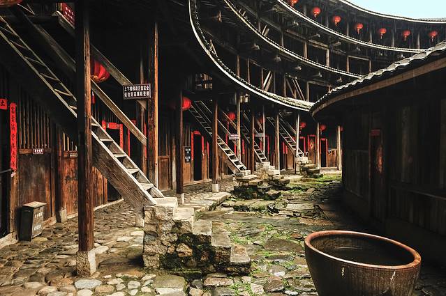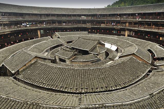 如果说只能看一个土楼,那么这个选择就非“承启楼”莫数了。承启楼是圈数最多的圆楼,由四个环环相套的同心圆楼组成,是内通廊式圆楼的典型。全楼平面布局与《易经》先天六十四卦图的太极、两仪、三元、四象、八卦、六十四卦相呼应。进入楼内,宛如进入一个迷宫,令人东南西北方向莫辨。