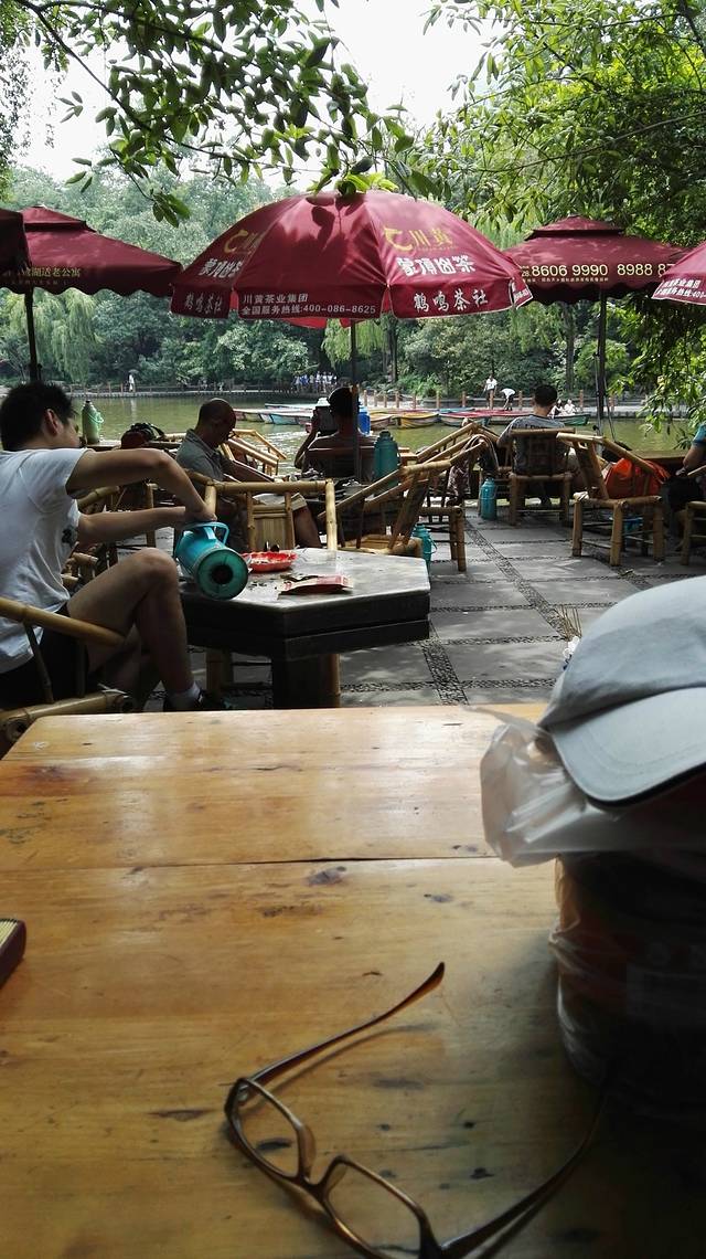 本次出行的最后一站就是人民公园的百年鹤鸣茶馆,进入茶馆感觉世界真的瞬间就安逸了下来,古老的木桌竹椅,古老的鹤鸣茶馆,古老的掏耳技艺,一切都融入了斑驳的树影。要了一碗蒙顶甘露,还是古老的盖碗,给了一暖壶开水,服务到此为止,剩下的都是自助式服务了。不过在添了三次水,眯了半小时后就再也坐不住了,看来在这安逸的世界上并不是我们能够习惯的生活,只能向往了。