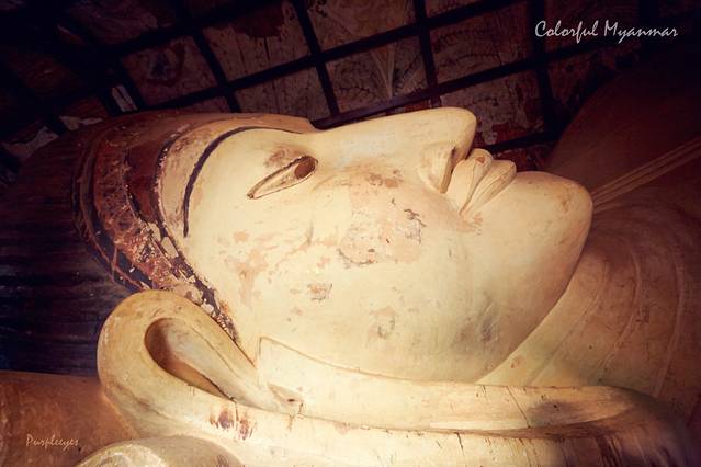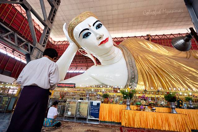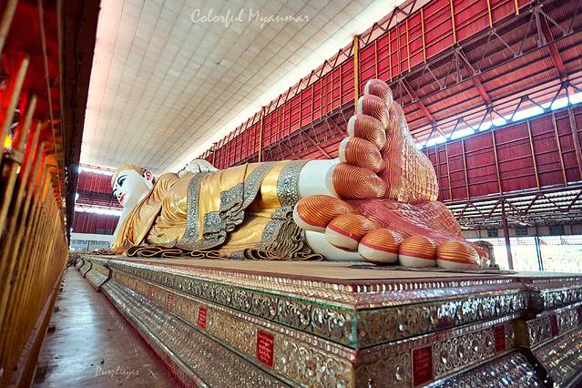 卧佛全长20米,高5.4米,原为一尊巨大的露天坐佛,后使用数量巨大的缅甸玉将其改造成现在的样子。大佛的眼珠用玻璃做成,以手枕头,两脚一前一后,脚 底有108个格子和图腾,每个都代表了六道轮回中不同的形象。其中59个格是人的世界,21个格是动物的世界,28个格是神的世界,代表佛祖已超脱这些层 次,不在三界中轮回的崇高意义。天花板上写满了捐赠者的名字和金额。如果你没有时间到勃固看缅甸最大的卧佛,那么这个就可以参观一下。