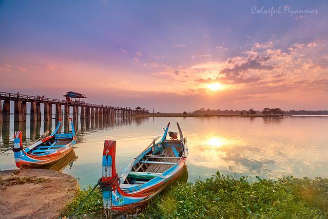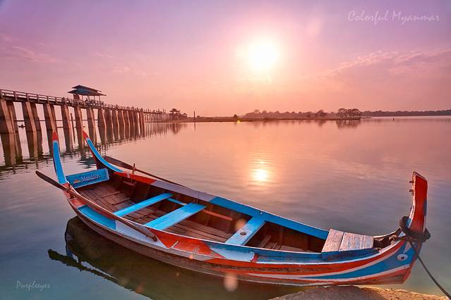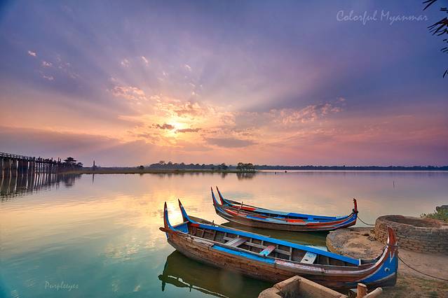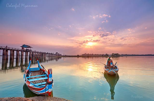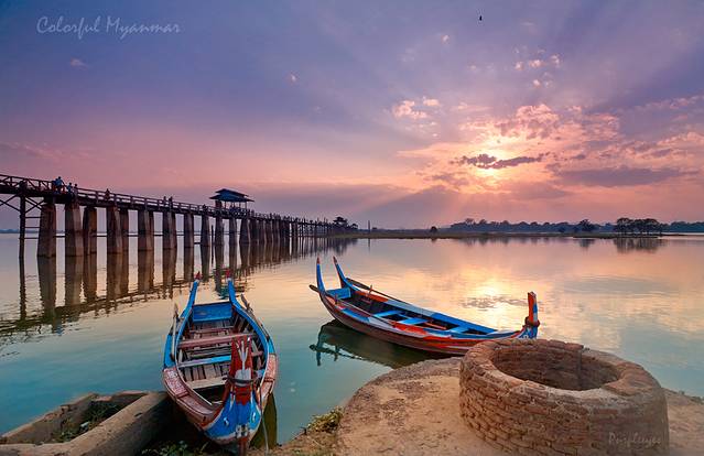 歇过来之后我就开始踩点儿了,然后我就发现,我们选的这个地儿忒好了!我们坐得棚子这边,有一个很小的码头,码头边停着那种专门拉游客过河的弯头小船,颜色十分鲜艳,远处有渔民在撒网,更远处有个湖心岛,树木丛生,再往远处就是云和夕阳了,老有层次了!当然,别忘了边上的主角:长长的乌本桥!