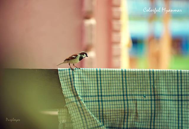 某个院子里晾着衣服,麻雀在衣服上快乐滴跳来跳去,赶紧抓拍!