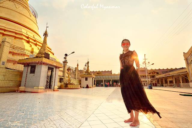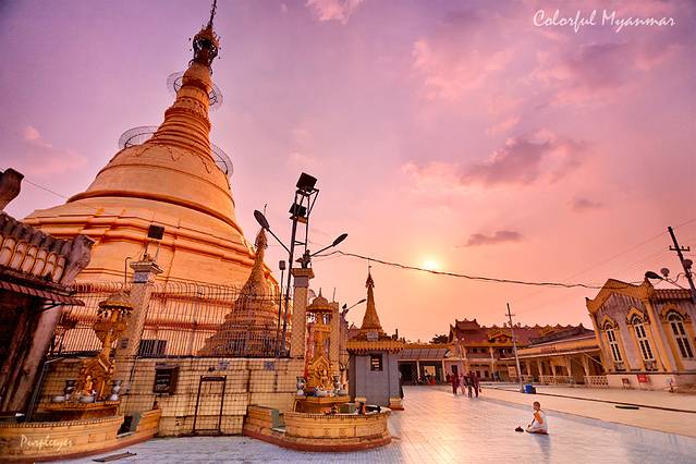 在努力忽略被烫的滋味的时候,我必须说,我被夕阳下的这座美丽的金塔震撼到了,尤其是它的下面还跪坐着一位虔诚的僧侣,因为太热的远古,整个天呈现出一种粉红色,但这位僧侣就那么虔诚滴跪在那里祈祷,跪了很久。真遗憾因为角度问题,我没有办法把塔尖也收进镜头里,但我依然必须说,我拍到了此行第一张很美的照片,烫么?俺已经忘记啦!