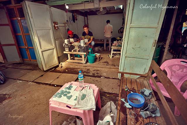 加工的铺子就更简陋了,就一个棚子,下面摆一排都看不出原色的机器,工人们就一个个蹲那儿,拿着石头开始切开始磨。。。反差忒大啊这个!