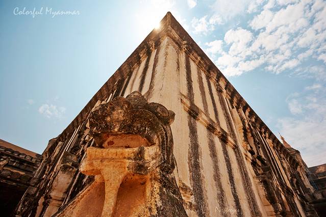 越过两座石狮子残骸,过一个马路就是著名的未完成敏贡佛塔了。这座半成品,即使是半成品,也超级雄伟的。不过只是从外面看而已,等我们进去了就郁闷了,里面的空间也就不到二十平米吧,仅仅是一个佛堂而已,就木有了。。。由于阳光太正了,我也就没有给它照相,这个塔还是让我们有些小失望的。