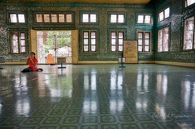 由于在曼德勒只有今天一个整天的时间,我们能去的地方非常有限,所以经过研究之后,我们决定先去敏贡古城,然后去玉石市场,傍晚去乌本桥看日落。不过一切都要等先换钱再说,因为我们又快木有钱啦!在咨询了前台之后,我们前往在酒店后面一条街上的换钱地点,谁知道走到那儿之后,人家还没开门呢,只有一个守门的告诉我们,十一点这里才开门。。。完,十点半我们就得赶上去敏贡古城的船,今天换钱没戏了。。。刘明月立刻开始体现地主婆本色,当即宣布不允许我乱花任何钱。。。。瞬间变刘扒皮了有木有!