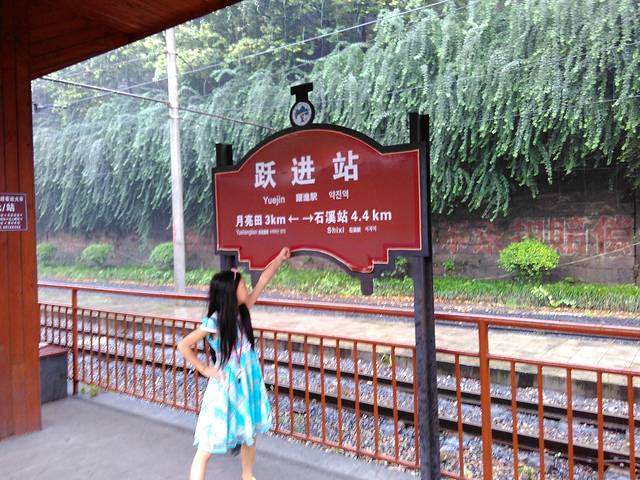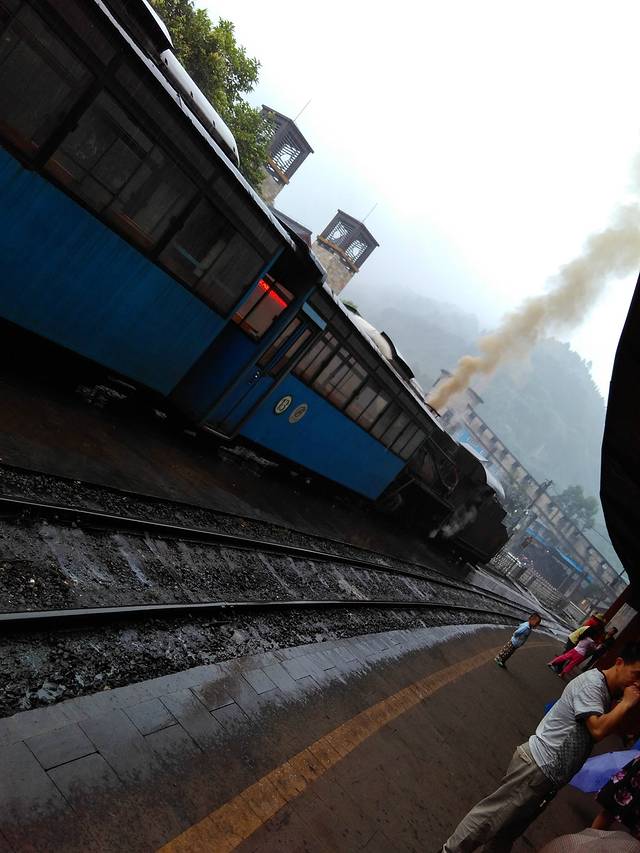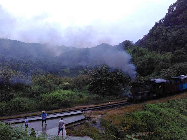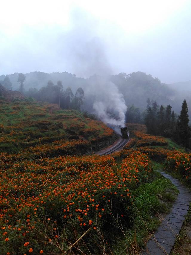 第二天一早8点多在酒店门口坐公交车,犍为到三井的,3.5/人,坐了大概50分钟到达三井,火车的跃进站。天一直在下雨,也好,那火车都是烧煤的,到处是煤灰,下雨空气好多了。单程,从跃进站坐到终点站(芭蕉沟站),全长近20公里,行驶时间大概2个小时(有可能更常,要错车就得等)。超过1米3的儿童也得购全票80元,我觉得真是不合理。票价也贵的不合理!坐在小小的原始火车上,感觉像是坐摇摇车。现在去没有油菜花,不过有油菜花的时侯人又太多,我还更不喜欢。现在去,也有花,油菜花变成了什么菊花,黄色的,也好看。还记住了一个,在亮水沱有蒸汽表演,还可以。到达芭蕉沟站已是中午12点多了,参观了博物馆,吃了午饭,坐老爷车20元/人到马庙。不得不说说这段15公里,风景是这两天看到的最美的一个地方,从芭蕉沟一直顺着一条小沟向下开,一路都是桫椤树,大大小小的瀑布,空气超好!这一段路特别适合徙步行走!