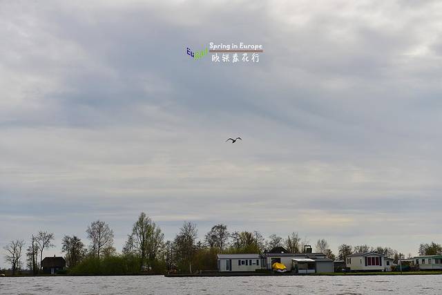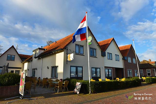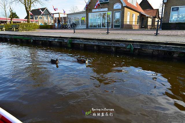 运河河道里有很多野鸭等水鸟在嬉戏,基本不怕人和船只。岸上那家插满旗帜的是在主路上的水产快餐店,供应的荷兰腌鱼特别好吃,我们也在那里安排吃了一顿,口味非常棒,价格还很低廉。它家并非完全供应给游客的,村里人也很喜欢在那里就餐。
