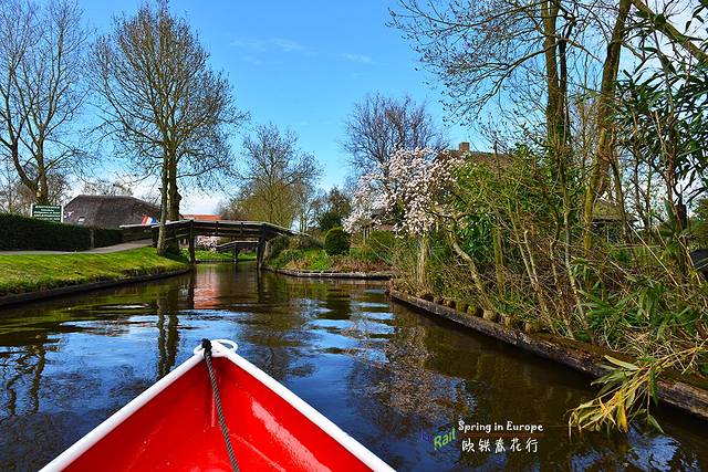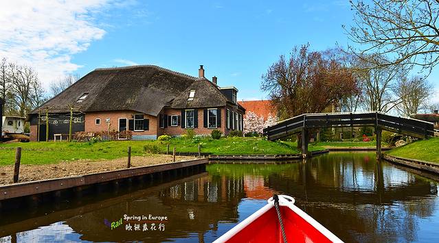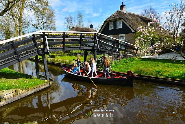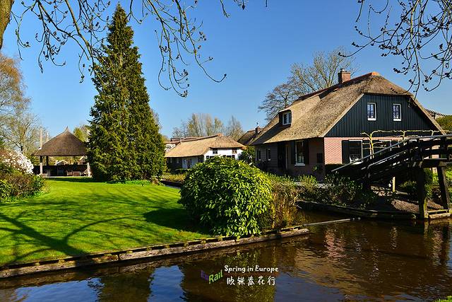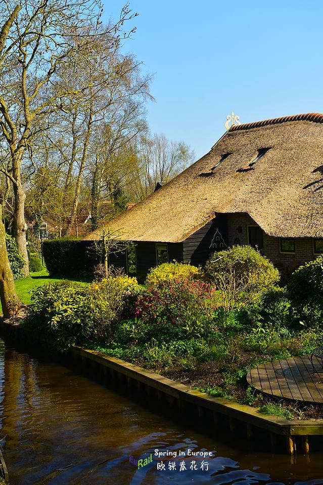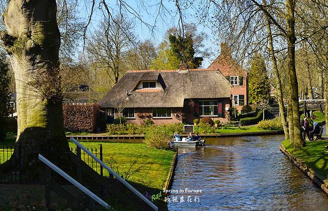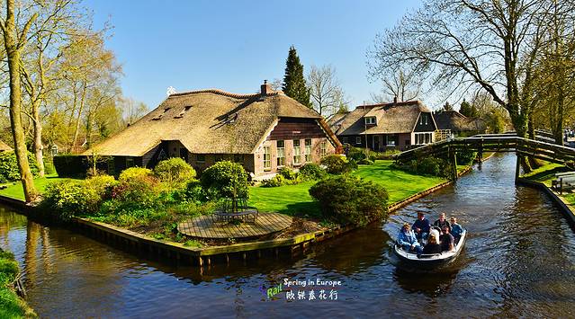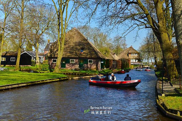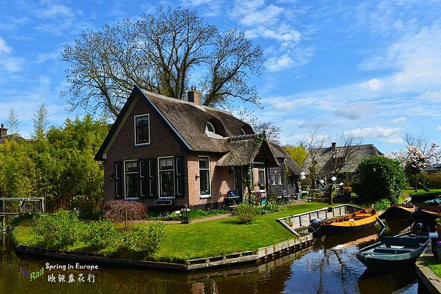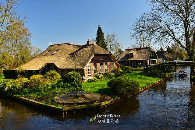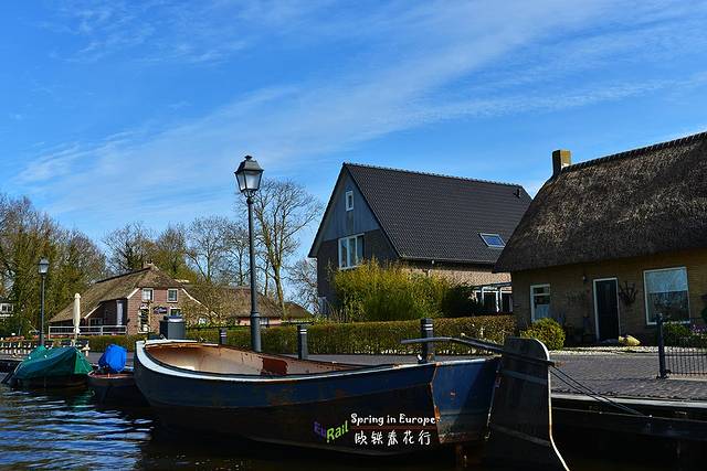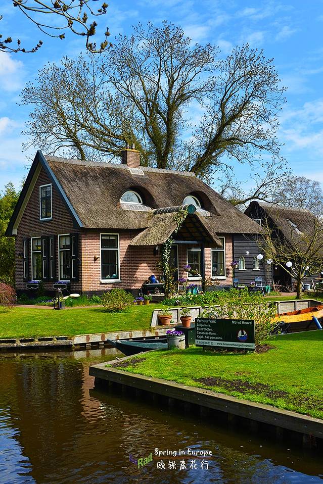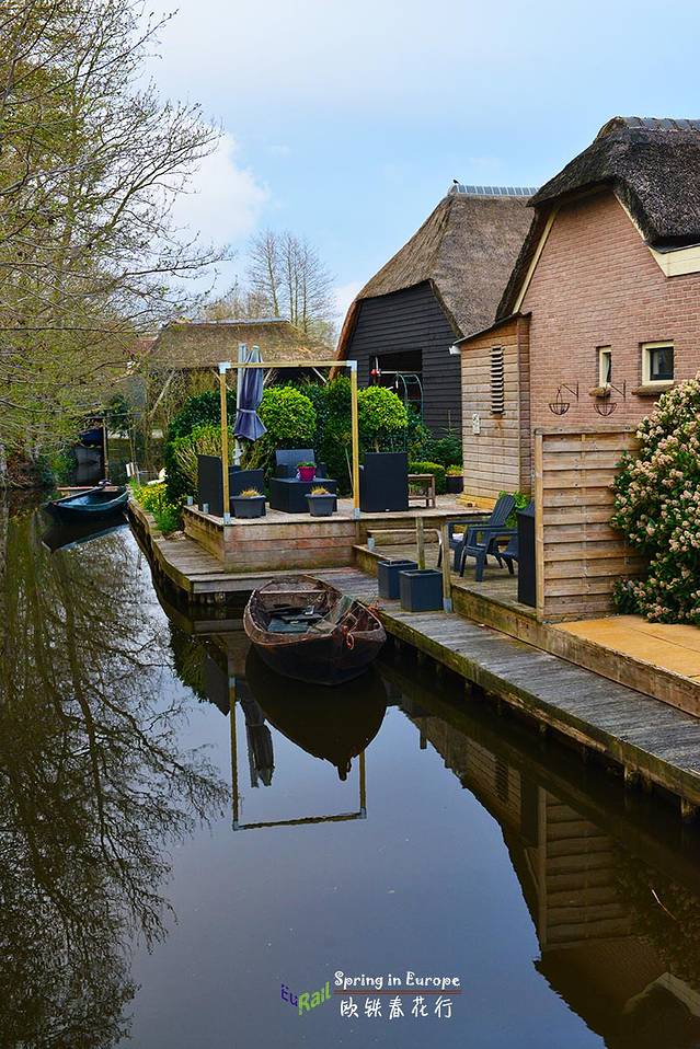 荷兰中北部的羊角村(Giethoorn),属于大片的洼特莱克(WaterReijk)湿地公园的一部分,其湖泊、村落间的运河、木桥和浮桥等都具有威尼斯的特征。这里的一切生活都围绕着村落间的运河和随处可见的芦苇农舍而展开,幽雅宜人恬静的风光如同天堂一般。