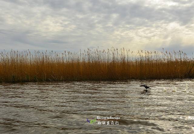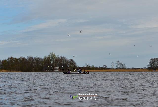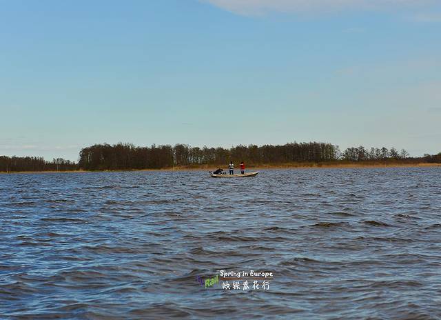 博文怀德湖坐落在羊角村东南、德•库鲁姆特东侧,周边的芦苇映衬着蓝天、白云、树林、村落,视野开阔、景色优美。湖面还是很开阔的,所以即便没有大风,但是涌浪还是不小,我们的小舟在水面上行驶,其实我内心里是有点忐忑的,毕竟是铁船,万一倾覆是会沉没的。不过表面上我还是要保持沉稳,要有风度,要上相!