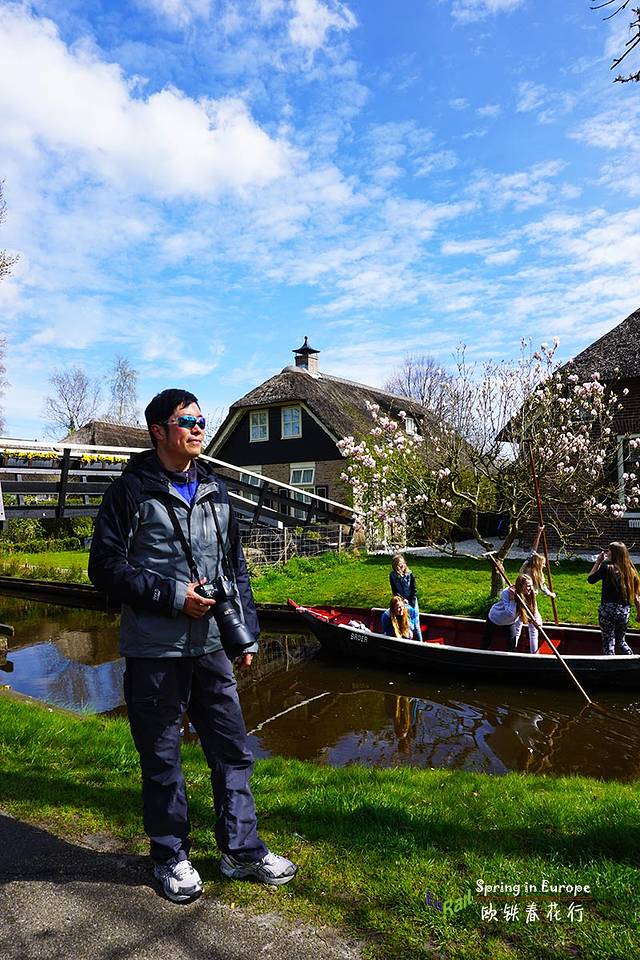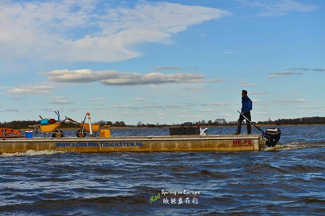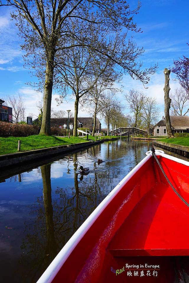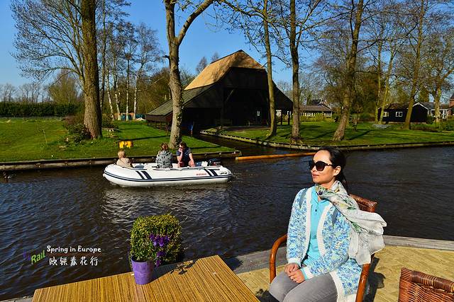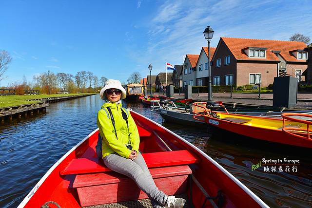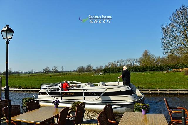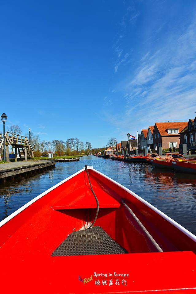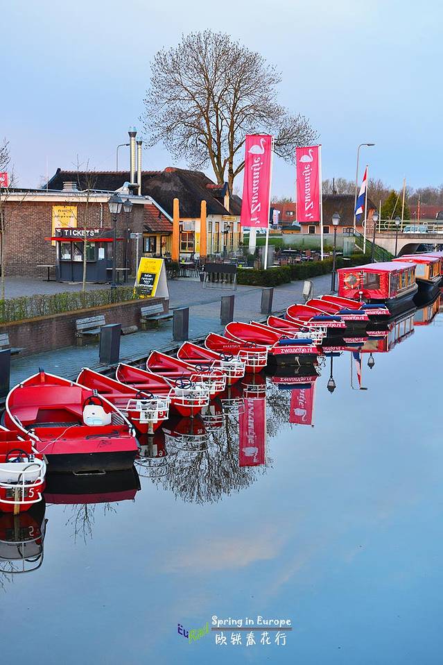 在村头最大的那家游船公司租赁小船,最小最便宜的那种永远是最抢手的,所以租不到,只能租了这种每两小时20欧元的船儿。在羊角村泛舟,一个小时肯定是不够的,以2-3个小时为宜。我们当天是租船时间晚了,到他们下班时间点只有两个小时了。小伙子要求我们一定要在两小时内赶回来,否则他就来不及回家和他娇妻共进晚餐了……