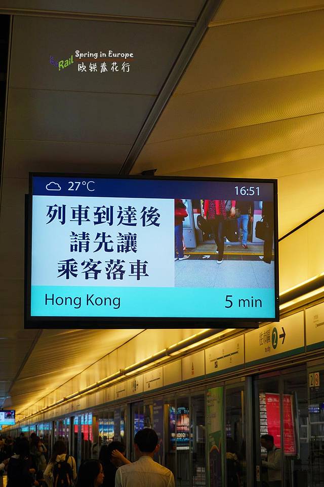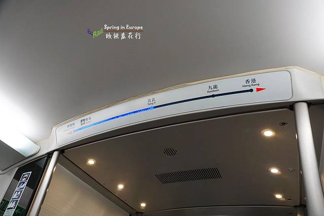 机场快线往市区方向,一共只有四站,机场站、青衣站、九龙站和香港站,从机场到香港岛,只需要24分钟。车厢上有列车行进的标识,看到蓝色抵达什么位置就知道列车目前的行车进度,一目了然。