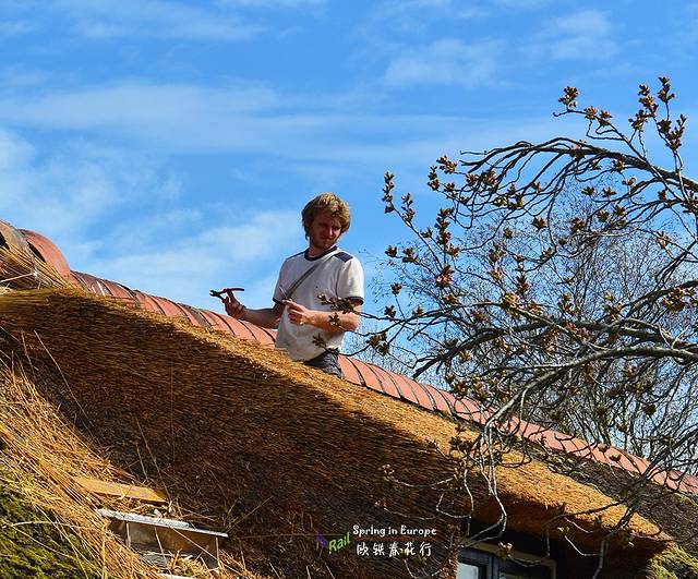很幸运能够看到一家民居正好在翻修屋顶的芦苇,看到院子里放着成捆的芦苇,然后有个小哥在屋顶干活,已经把腐朽毁坏的芦苇撤掉,开始换上金黄色的新草。