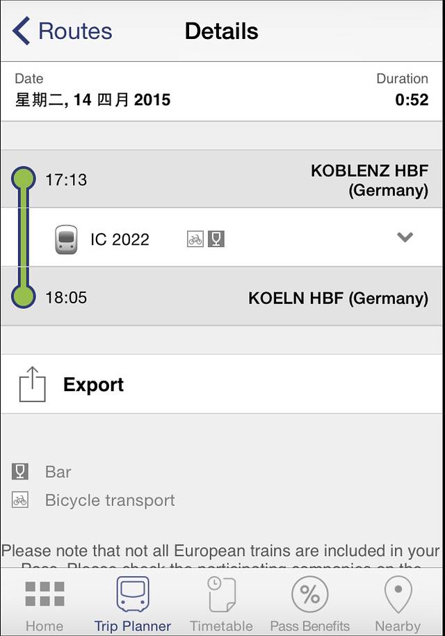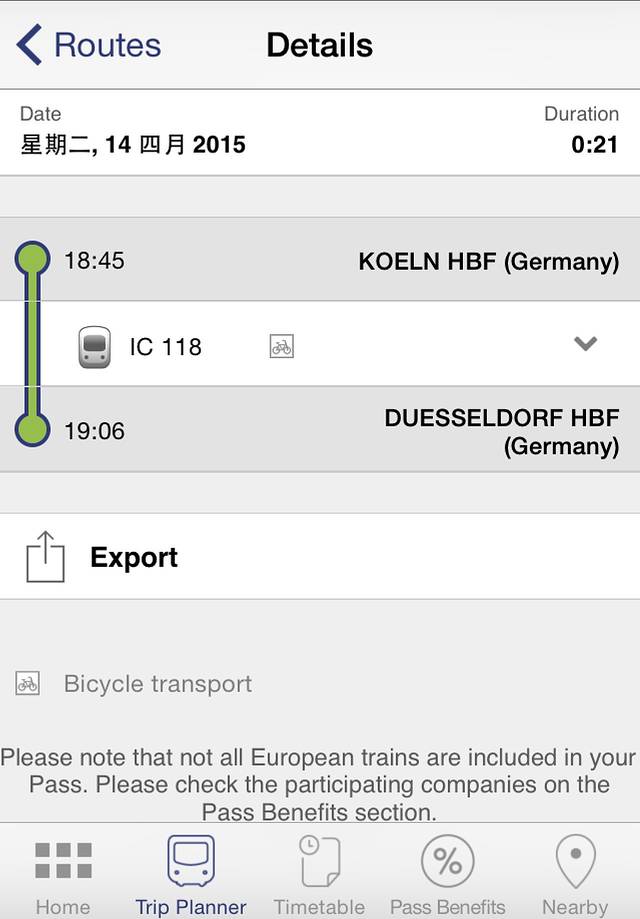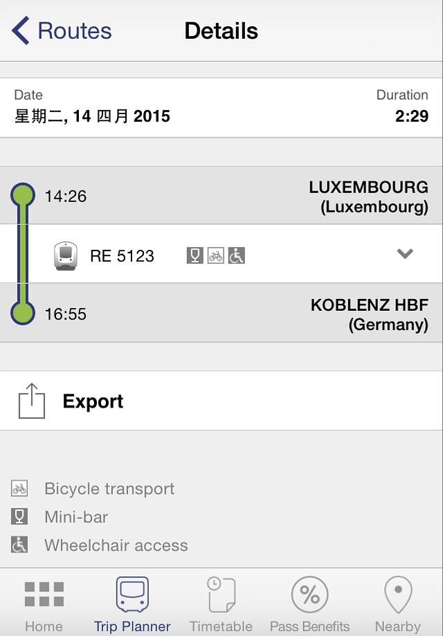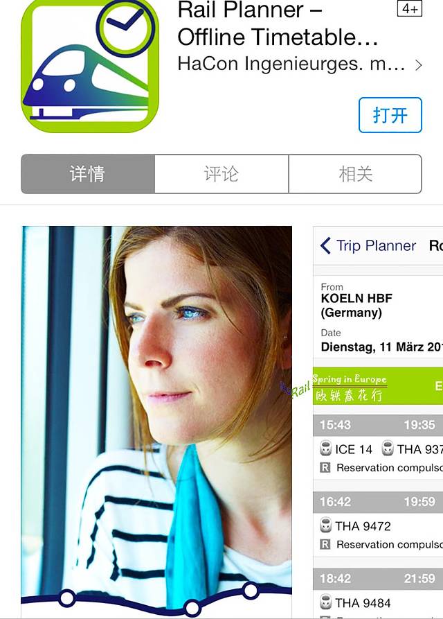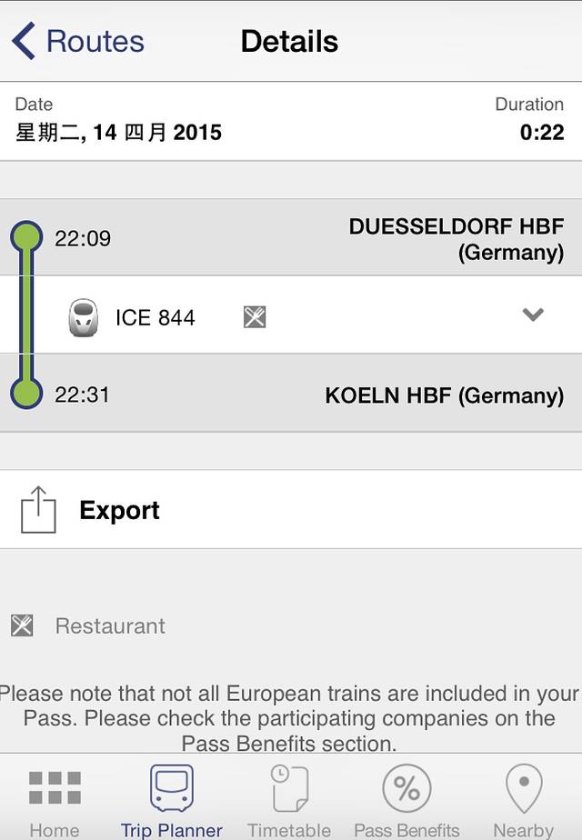 这个app的好处是,可以离线设计线路,这样万一你的行程因为某种原因无法按照既定方案继续的时候,可以随机应变,重新计划。而且这个app在你乘车途中打开,界面左侧绿色进度条会显示你目前在什么车站之间,然后前方是什么车站,到你的目的地还有几站等信息。由于在欧洲旅行,铁路广播里并非都有英文播报站名,因此这个功能也是非常有用的。