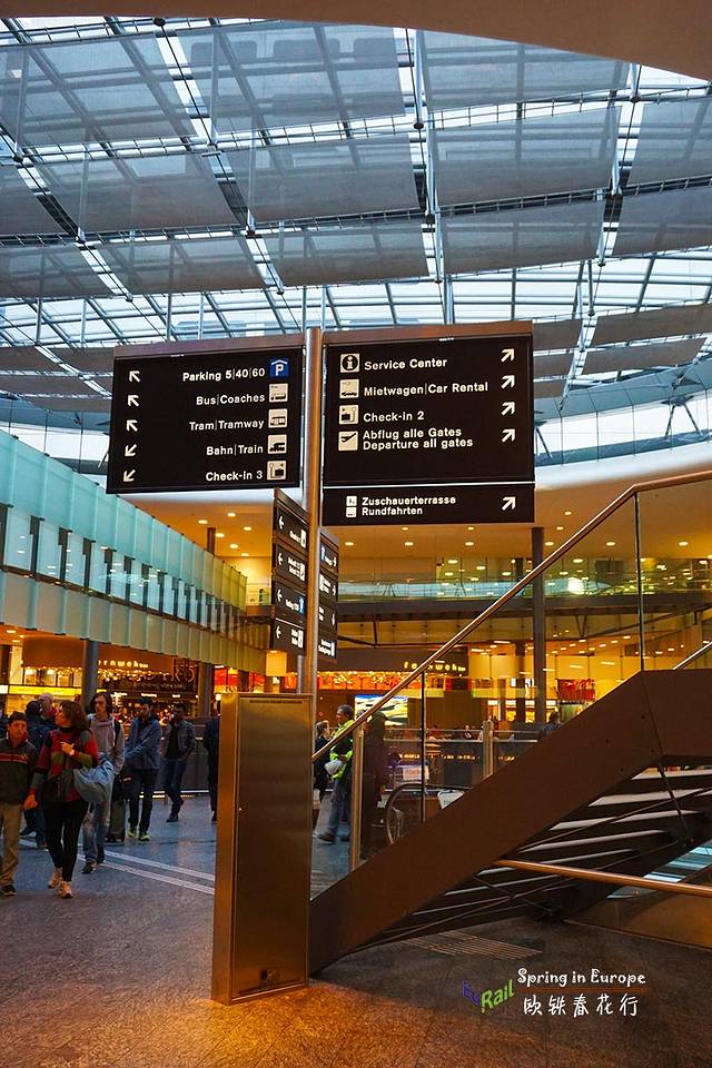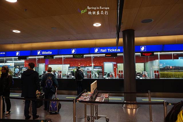 从苏黎世机场的国际到达大厅,往出口方向穿过一条马路,就是苏黎世的出发大厅。大厅中央的指示牌上,非常清晰地指向了各个目的地:向左上楼是停车场,巴士站和电车站,向下是火车站和第三航站楼入口;向右上楼是游客服务中心、自驾租车和机场的登机口。我们要搭乘的欧铁火车就在机场的地下,非常方便,不过我们现在先不着急下楼。
