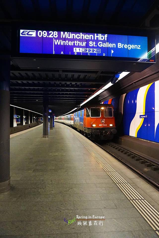 下到火车站的那层,搭乘电梯下楼的时候要看清站台,我们第一段搭乘的是从苏黎世到慕尼黑的那班列车,在苏黎世机场路过,停靠1号站台。机场的火车站站台非常空旷,完全不像我们我国火车站的那种熙熙攘攘。