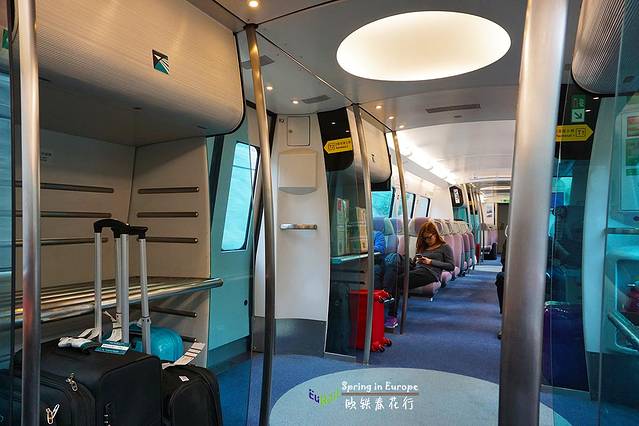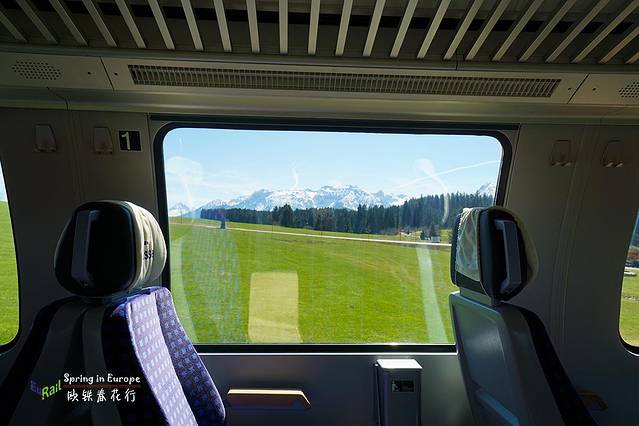一等座的车厢,拥有大面积的观景玻璃窗,可以尽享窗外的美景。我们降落的那天起,欧洲大地的雨雪天气正式结束,开启了晴好模式——应该说我们的旅行人品还是杠杠的!