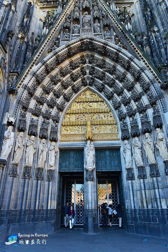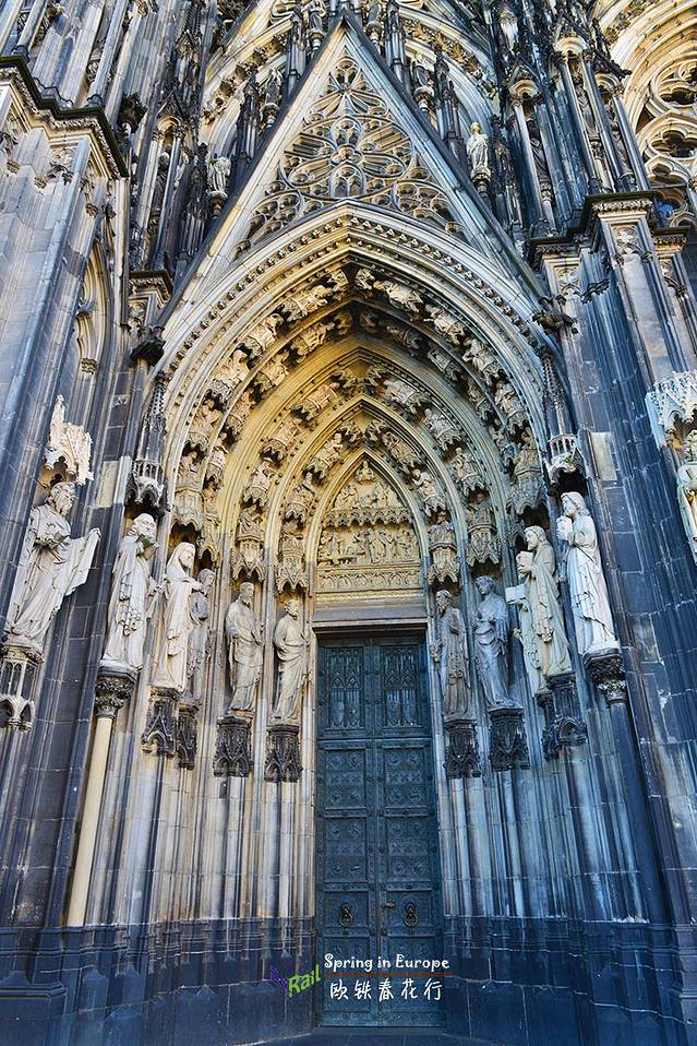 科隆大教堂正门双塔中的一个大门,可以看到门楣上拱的精美雕刻装饰和圣像,莫不栩栩如生,令人肃然起敬。